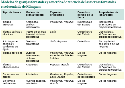 Los hogares han desempeñado un papel importante en estos logros puesto que han plantado y ordenado árboles en las tierras agrícolas de su propiedad y en otras tierras que rodean residencias. En la mayor parte de los casos, los agricultores pueden cosechar árboles con toda libertad. Las especies plantadas preferidas son las especies de crecimiento rápido como Populus y Paulownia. La ordenación de los árboles y bosques se realiza mediante acuerdos individuales o con cooperativas que pueden adoptar múltiples formas (véase el cuadro) (Zhu, 1997).