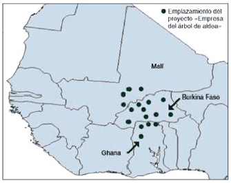 En un primer momento, las labores del proyecto se iniciaron en 29 aldeas y ocho emplazamientos en Burkina Faso, además de en otras seis aldeas situadas en Malí a escasa distancia de la frontera entre ambos países. En abril de 2005, TREE AID subvencionó la continuación de las labores del proyecto y su extensión por un período de cinco años, con la finalidad de abarcar 50 aldeas en Burkina Faso y 20 en Malí. Una financiación adicional para ampliar ulteriormente la iniciativa en ambos países provino del Programa de acción forestal tropical de la Comisión Europea. Una iniciativa paralela se puso en marcha en el norte de Ghana a finales de 2006. La Empresa del árbol de aldea no tardará en implantarse en 172 aldeas en 17 emplazamientos (Figura 1).