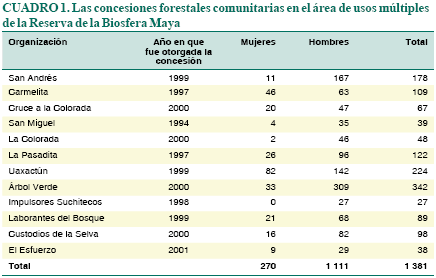 La Reserva de la Biosfera Maya tiene una extensión de 2,1 millones de hectáreas y está divida en tres áreas: un área núcleo, que comprende parques nacionales y biotopos protegidos; un área de usos múltiples, en la que se otorgan concesiones forestales; y un área tampón, en la que algunas tierras son propiedad de cooperativas y de ejidos municipales (tierras del Estado administradas por el gobierno municipal) pero en la que el uso de la tierra, incluso en las propiedades privadas, está reglamentado (Carrera et al., 2006). En 2004, había en el área de usos múltiples 13 concesiones forestales comunitarias, dos concesiones forestales industriales y ocho cooperativas. Doce concesiones comunitarias contaban con asistencia del Programa de Biodiversidad y Silvicultura Sostenible (BIOFOR) de la Agencia de los Estados Unidos para el Desarrollo Internacional (USAID) y de Chemonics International.