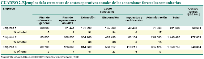Las necesidades financieras de las empresas forestales comunitarias varían de unas a otras en función de las cantidades de madera por cosechar, la distancia que separa la concesión de la comunidad, las decisiones internas relativas a los niveles de sueldos y la calidad de los equipos poseídos por la empresa. La capacidad productiva de cada concesión varía según la densidad de madera comercialmente viable que se haya encontrado. En la cosecha de 2004, las concesiones asistidas por BIOFOR cortaron unos volúmenes que iban de los 315 a los 1 791 m3 y de 116 a 1 008 árboles. Los costos de extracción iban de 37,27 dólares EE.UU. a 101,53 dólares EE.UU. por metro cúbico (BIOFOR/Chemonics International, 2003).
