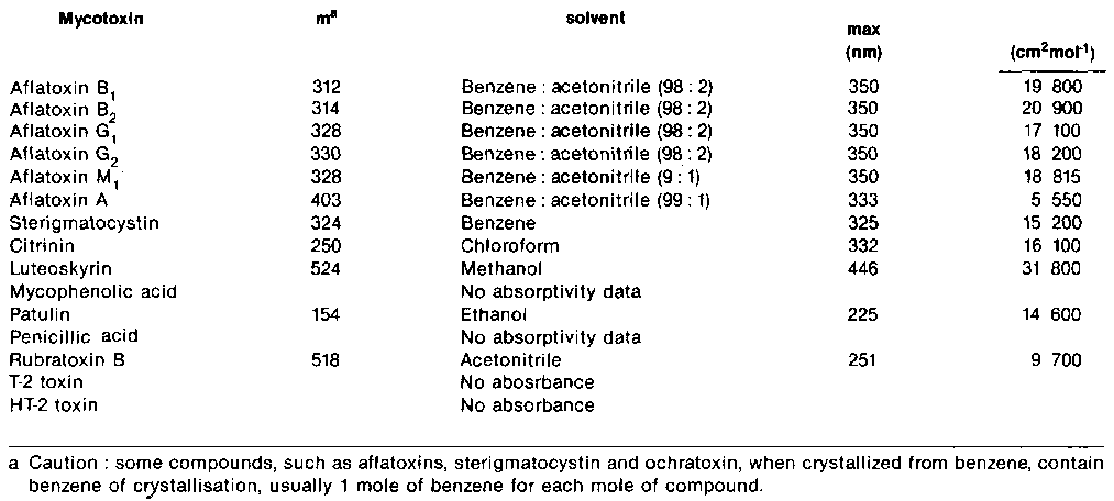 Standard aflatoxin are obtained from many sources Table II. The standard is often a source of error in analysis. The accuracy and purity of the standard or standard solution is the responsibility of the individual analyst. The standard solution must be prepared with the same solvent that will be used for the sample extract. Acetonitrite-benzene (2+98) is used for the more soluble aflatoxins (B1, B2, G1 and G2) or Acetonitrite-Benzene (1+9) is used for the aflatoxins to the glass wall of container and (c) detection of deterioration or decomposition during storage of the solution. The aflatoxins are liable to light or UV irradiation both as solid and in solution in such solvents as benzene, chloroform, ethanol methanol, or water. When not used, the standard solutions should be stored in the dark and at low temperature.