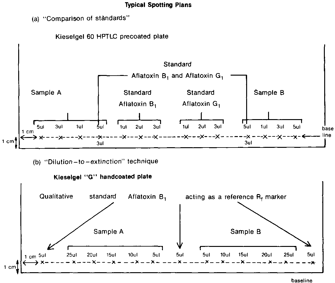 Under UV (365 nm) light look for a blue fluorescence in the sample at an Rf corresponding to aflatoxin B (B1 and B2 will not be resolved) in the standard reference marker. The object of this technique is to find a dilution of the extract, such that, a 15 ul or 20 ul aliquot applied to the TLC plate will give a blue fluorescence of aflatoxin B which is JUST VISIBLE. This means that the 5 ul and 10 ul aliquot will give no fluorescence but in the 25 ul aliquot the fluorescence will be easily visible. Consequently, if the chromatogram shows blue fluorescences in all the aliquots, then the extract has to be diluted sufficiently to give the above extinction point. Trial and error and eventually experience enables the correct dilution to be made and the extinction point determined efficiently.