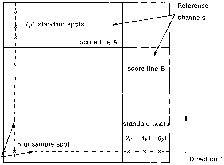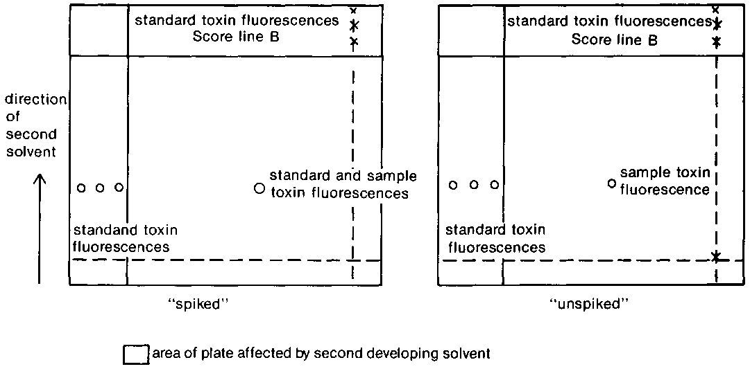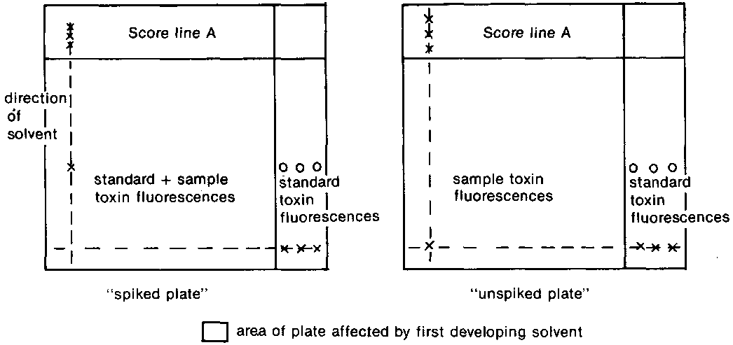 Standards are applied to the plate on the pencil lines in the reference channels and the sample is applied at the junction of these two lines (see diagram above). This means that the sample is in line with the standard when the plate is developed in both directions. Only one sample can be assessed at a time. The same solvent system can be used in both directions, or two different systems can be used. Another plate is scored and spotted, identical to that just spotted, with the exception that an extra 5 ul of standard solution is applied on top of the sample spot, which acts as an internal marker for the toxin on this so-called "spiked" plate. The former "unspiked" plate is developed in the same tank as the "spiked" plate, so that the development conditions are exactly the same for both plates. The plates are placed in the tanks such that their coated surfaces face towards the centre, but do not touch. The solvent is allowed to rise up the plate until score line A is reached. The plate is removed and thoroughly dried in the dark (no solvent residue should remain).