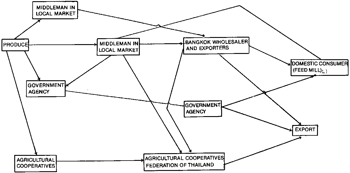 During the harvesting season, local dealers are busy on travelling to and fro to buy maize to be stored in godowns, bins and silos. All the purchase is wet. The dealers must dry the grain before storing it because of the ensuing quality and value. Sun drying on cement floors is the most common practice but the amount of rain limits the utility of the floors. Aflatoxin can became a serious problem, when the wet grain cannot be dried quickly. Research by DOA indicates that if the wet grain cannot be dried within 72 hours, Aflatoxin can be a problem. As shown in Fig. 1, local dealers will move the maize to Bangkok wholesalers for export or domestic use. Some local dealers also are involved in moving directly from producing area to overseas importers. Cooperatives also take a small part in the marketing channel. It was found that Aflatoxin contamination in pre-harvest maize is relatively low but increases rapidly during the period the grain is handled by local dealers. As the problem became serious, local dealers now pay more attention to solutions. Several types of mechanical dryers, storage facilities and siloes with dryers have been placed in many parts of the country for drying and handling the grain. Some mould inhibitors also are used in domestic feeds.