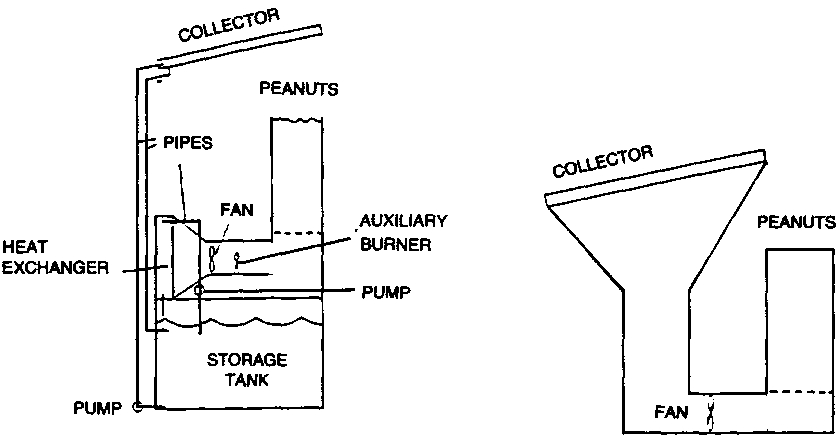 Several feasibility studies of solar-assisted peanut drying units have been conducted as shown in Figure 3 (see Fig 3 Peanut dryer with solar heated water and solar-heated air). Troeger and Butler (5) compared a water and an air solar systems with a conventional LPG dryer. The result reveals that the greater the percentage of split kernels, the greater chance of fungal penetration. Both water and air systems performed well. This systems equipped with a 70 m² collection and a 7570 lifer water storage, can supply 75% of the energy needed to dry 4080 kg of peanuts from an initial moisture content of 20% to a desired 10% level in 24 hours. As with other types of grain and crop drying, its economic feasibility will be greatly enhanced by multiple use.