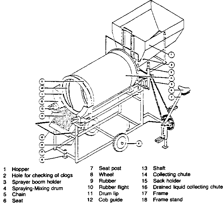 A pedal-driven chemical applicator (Fig 6 A pedal-driven Chemical applicator for freshly harvested maize cobs) consists of a hopper, spraying-mixing chamber, a collecting chute, pedal driven mechanism, cam-plunger assembly, spraying system (knapsack sprayer) and a frame. The hopper is a wedge- shaped type flow bin with an opening on the side and the hopper bottom was made movable so that maize cobs would flow continuously into the spraying-mixing chamber. The spraying-mixing chamber is made of an empty plastic drum with 4 helical rubber flights. The cob collecting chute is made of a perforated G.l. sheet for the spray solution and cobs to separate systematically and the frame was made of G.l. pipes and angle bars with two 25-cm wheels.