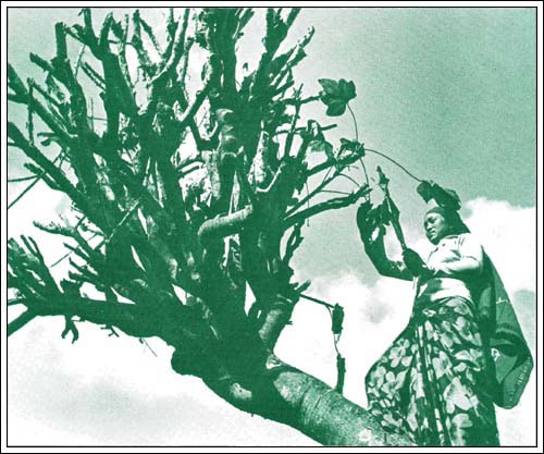 la última hoja—una nepalesa recoge forraje de un árbol casi desnudo