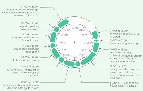 | Sierra Leona: el horario de una mujer | El esquema de la izquiera pone de manifiesto la desbordante actividad cotidiana de una mujer de una pequeña aldea de Sierra Leona—y esto en una región donde la escasez no es tan severa como en otras regiones de Africa. Casi todas las actividades mencionadas las llevaba a cabo la mujer mientras vigilaba a sus niños pequeños. Las mujeres de la aldea se quejaban de varios aspectos concretos de su vida diaria: