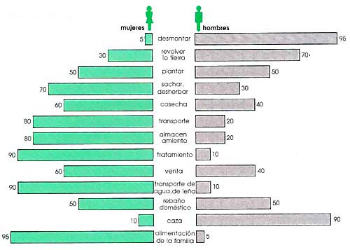En muchas sociedades las tradiciones que gobiernan la repartición del trabajo son parecidas. Los hombres desmontan, revuelven la tierra, cazan, pescan, y plantan algunos de los cultivos. Las mujeres hacen lo demás—lo que incluye mucho más que el cuido de la familia. En la mayoría de las sociedades son las mujeres quienes plantan, deshierban, cosechan, llevan a casa los cultivos, la leña y el forraje, los almacenan todos y ponen en venta lo que sobra. Pero este repartimiento del trabajo está cambiando.