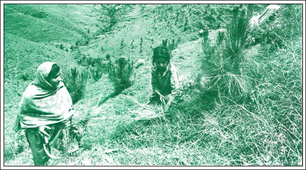 cuando las mujeres ya no pueden pacer su ganaderì en tierra dedicada a la repoblación forestal se ven obligadas a cortar y transportar todo el forraje que requieren sus búfalos