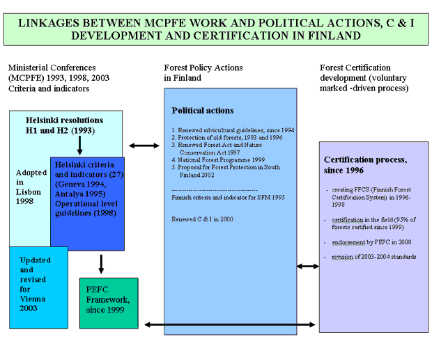 Scheme of linkages between MCPFE work and political actions, criteria and indicator development and certification in Finland.