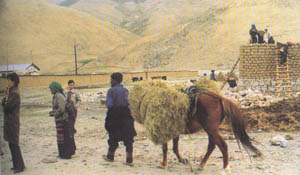 Figure 10. Hay being taken to market, above Lhasa, Xizang, China. The climate of the plateau is too harsh for cultivated fodder but some Pennisetum flaccidum reaches mowable height in protected places