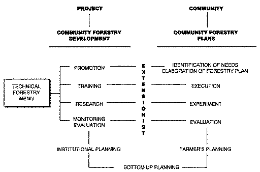 The methodological approach can be summarized as follows. The project promotes a technical menu called "Community Forestry Development" at village level. This technical menu consists of tree production, planting and management and the commercialization of forestry products. It is oriented towards agroforestry, in order to integrate forestry and tree activities within agriculture and livestock production systems. Extension activities (promotion, training, research, monitoring and evaluation) are oriented towards establishing a dialogue with the local communities on the basis of this technical menu. As soon as the local communities have decided to start forestry activities, the extension worker starts supporting them in the -preparation of their "Community Forestry Plans". A clear distinction must be made between Community Forestry Development, which is an institutional proposal, and the Community Forestry Plan of the communities, which is an adaptation of the institutional proposal on the basis of local needs and priorities determined by the local communities. The approach can be visualized as follows.