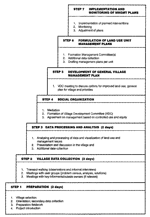 The planning process is implemented by the villagers together with an interdisciplinary team of outsiders, consisting of a Range Forest Officer, a Forester and Forest Guard, a Social Organizer, a female Programme Officer and a female Forest Extensionist. Experience has demonstrated that the process, up to the implementation of the first plans, takes around 20 days per village, spread over a period of two to three months, depending on the local conditions. Broadly speaking, the following phases can be distinguished during the process (see Figure 5.2): (1) preparation; (2) data collection; (3) analysis of village land use; (4) social organization; (5) development of a general village management plan; (6) development of management plans for specific land use units; and (7) implementation and monitoring of the management plans.