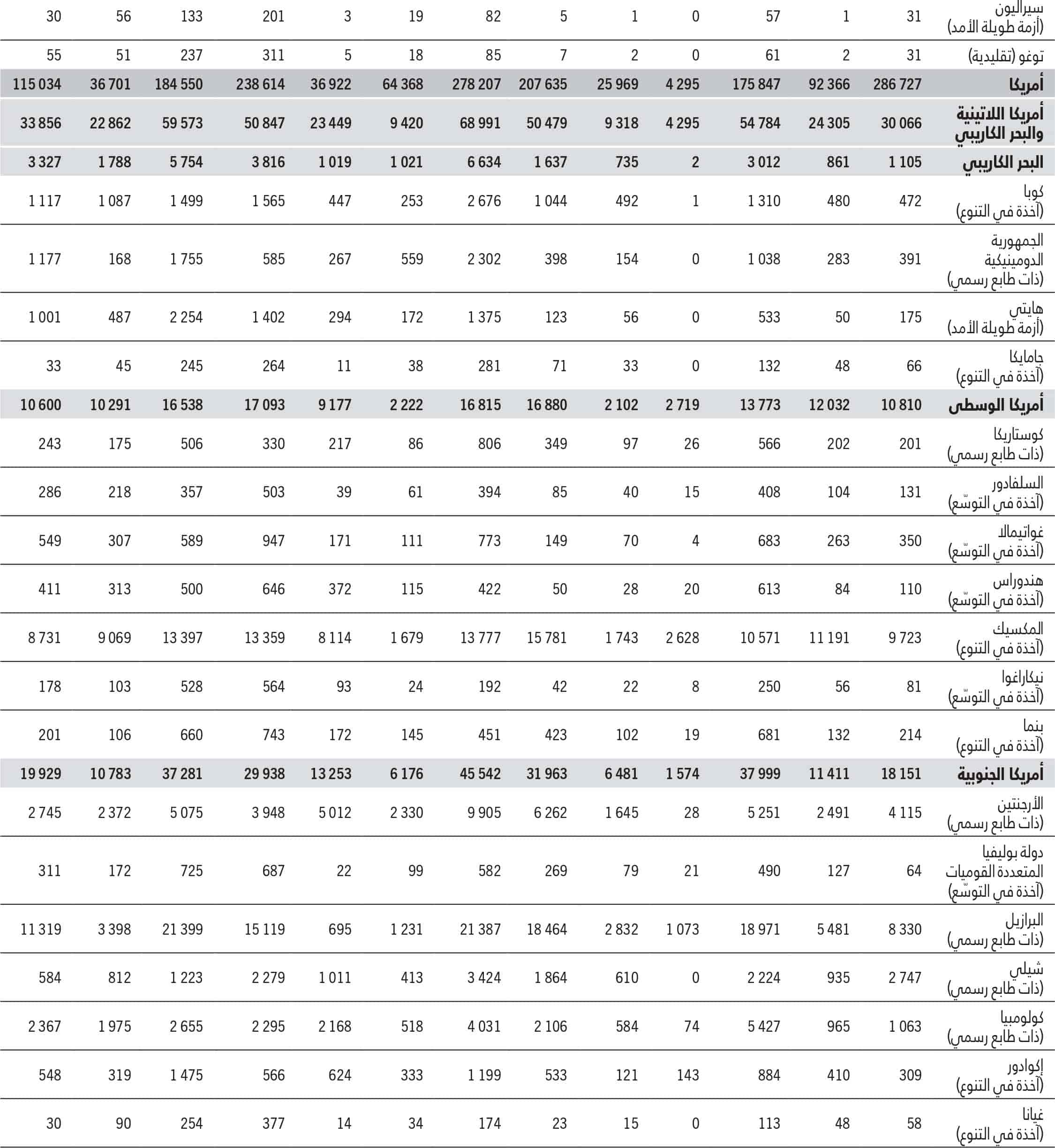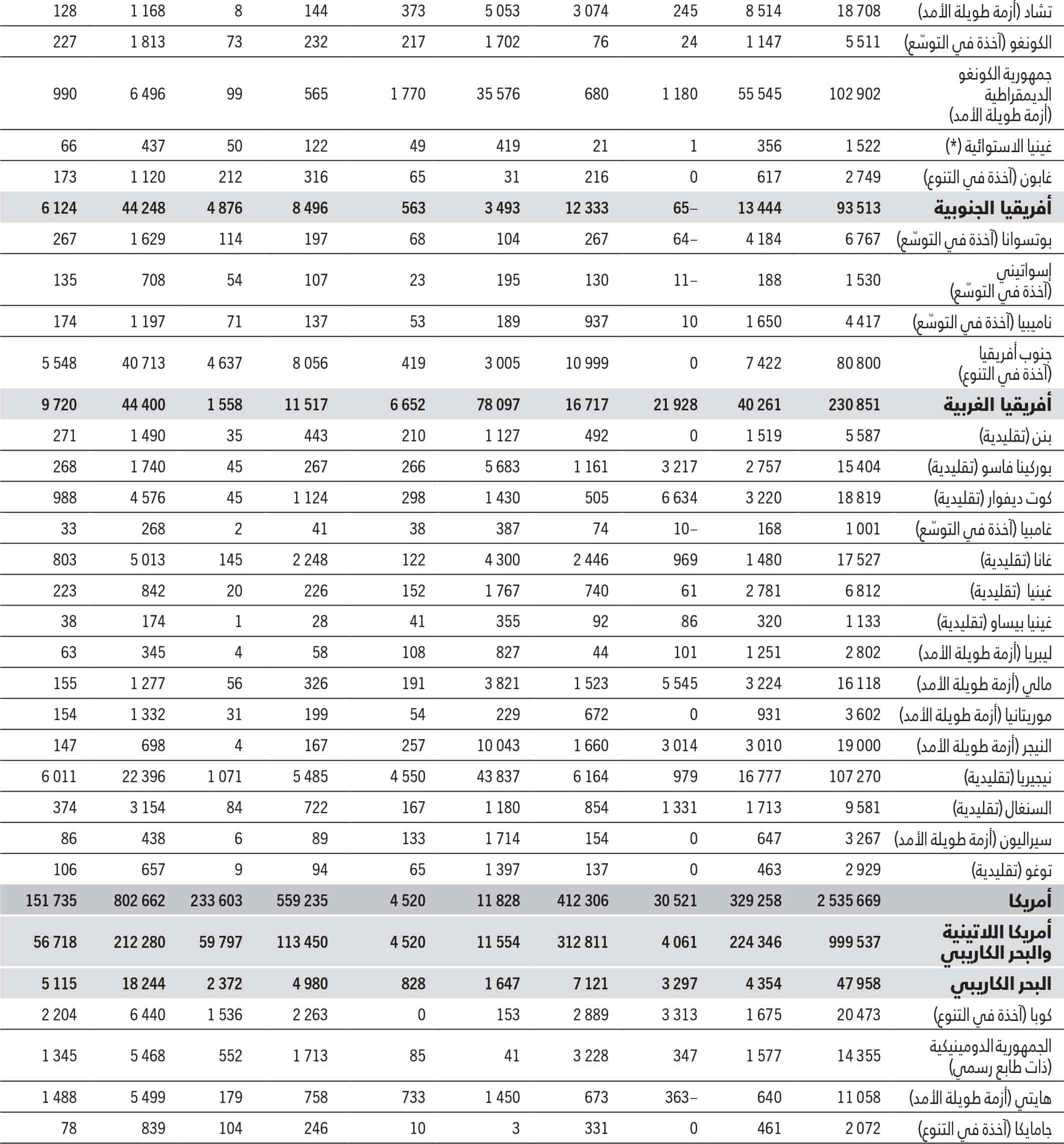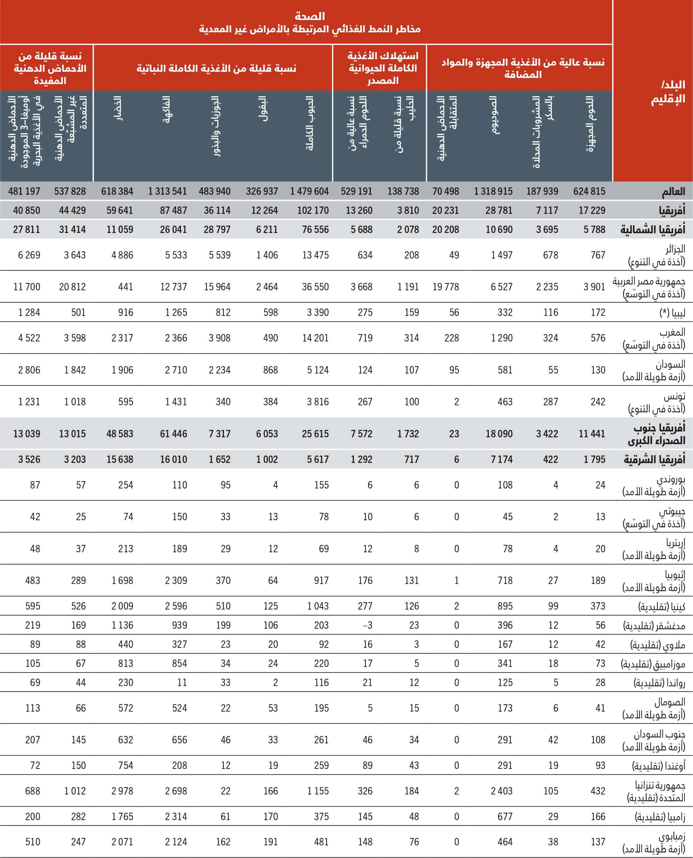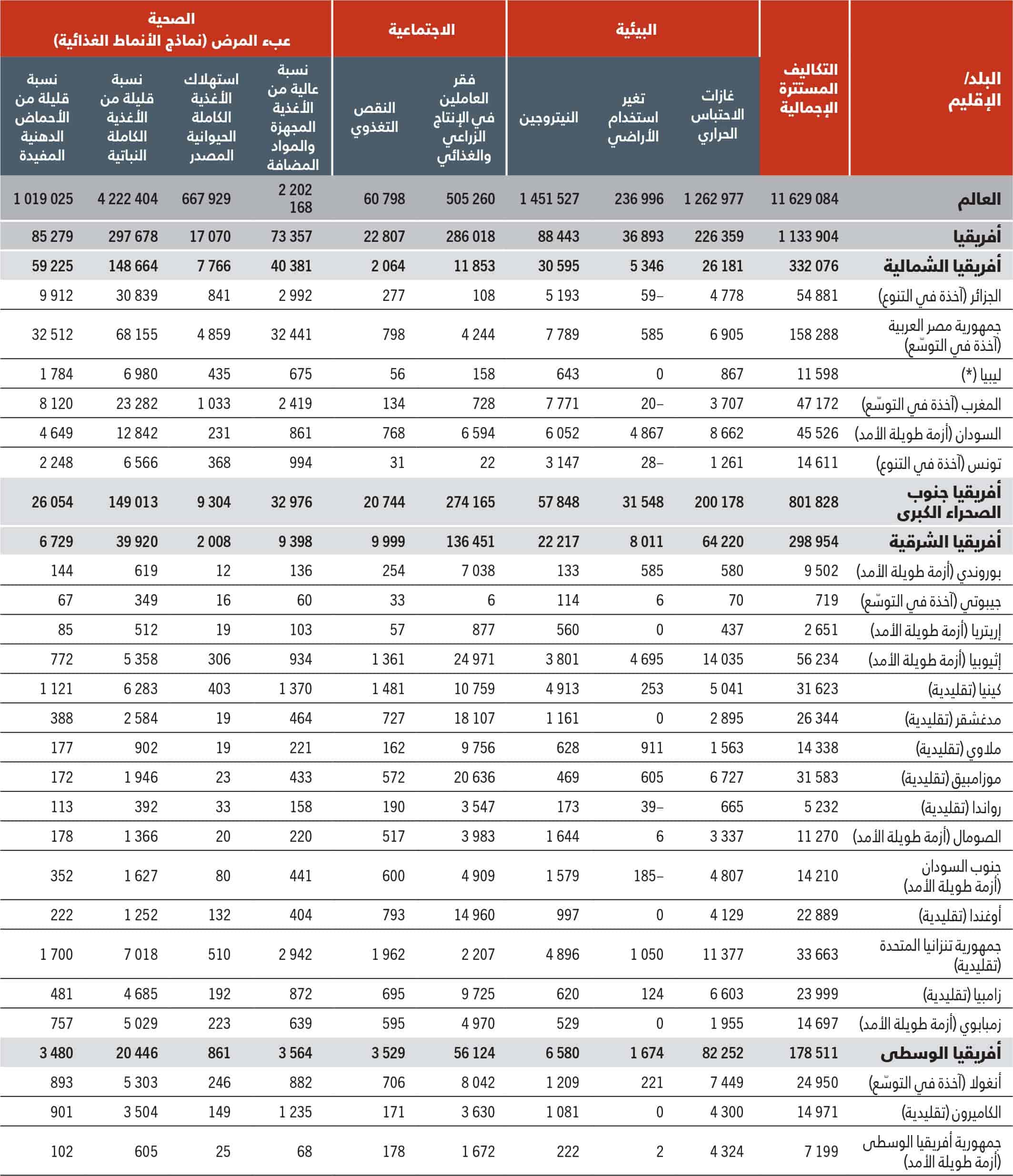 ملاحظات: جميع القيم هي قيم متوقعة. وإن القيم السلبية للتكاليف المستترة بفعل تغير استخدام الأراضي تُعزى إلى عودة الغابات أو الأراضي الطبيعية الأخرى على الأراضي الزراعية المهجورة (من خلال التحريج أو إعادة التشجير) ما يؤدي إلى منافع مستترة على شكل استعادة خدمات النظام الإيكولوجي – معبرًا عنها هنا على شكل التكاليف المستترة السلبية. وتشير الأوصاف الموضوعة بين قوسين إلى التصنيف الذي ينتمي إليه البلد: أزمة طويلة الأمد؛ تقليدية؛ آخذة في التوسّع؛ آخذة في التنوع؛ ذات طابع رسمي؛ صناعية؛ لا ينطبق (*). وبالنسبة إلى تفصيل مخاطر النمط الغذائي المرتبطة بالأمراض غير المعدية، انظر الجدول ألف 2–2. وبالنسبة إلى المنهجية، يرجى العودة إلى منظمة الأغذية والزراعة. 2023. حالة الأغذية والزراعة 2023. الكشف عن الكلفة الحقيقية للأغذية من أجل تحويل النظم الزراعية والغذائية. روما. https://doi.org/10.4060/cc7724ar.وLord, S. 2023. Hidden costs of agrifood systems and recent trends from 2016 to 2023 – Background paper for The State of Food and Agriculture 2023. FAO Agricultural Development Economics Technical Study, No. 31. Rome, FAO. https://doi.org/10.4060/cc8581enوLord, S. 2024. Hidden costs of agrifood systems: an update to the methodology for the State of Food and Agriculture 2024. Rome, FAO.
