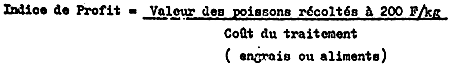 La croissance était assez lente faisant en moyenne 0,24 g/poisson/jour. Aussi il faut remarquer que le coefficient de transformation est très élévé étant de 20,8 en moyenne. Le fait que la conversion est élevée ne rend pas l'indice du ceût de la ration pour produire un kg de poisson trop fort car la drêche ne coûte que 1,1 F CFA/kg. Donc, en moyenné, cet indice s'éléve à 22,8 F CFA/kg.