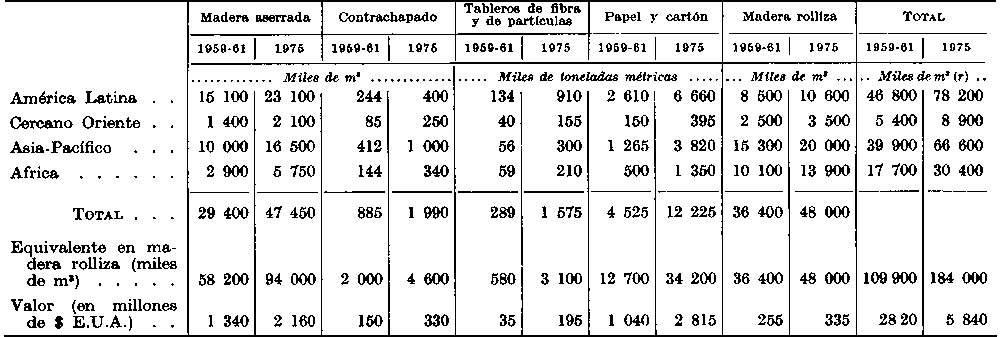 Para completar tal evaluación, habrán de considerarse las necesidades posibles fuera de los países en desarrollo a las que éstos podrán atender. En una serie de estudios recientemente realizados, se señala un déficit probable de la madera en Europa occidental y Japón, que siempre han importado de América del Norte y la U.R.S.S. Para los países en desarrollo que atiendan a esta posible demanda, las perspectivas son buenas, y si los países adelantados les ofrecen la ayuda necesaria (prestación de capitales, formación técnica, etc.) y los países en desarrollo toman las medidas necesarias (desarrollo de la infraestructura, instalaciones, mano de obra calificada, etc.), podrán llegar a exportar hasta 600.000 tm de pasta y productos de la pasta por año en 1975 (equivalente a unos 2 millones de m³ de madera rolliza), cuyo valor llegaría a ser al menos de 175 millones de dólares con los precios de 1959-61.2