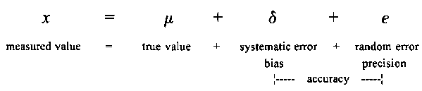 1. Random or unpredictable deviations between replicates, quantified with the "standard deviation".2. Systematic or predictable regular deviation from the "true" value, quantified as "mean difference" (i.e. the difference between the true value and the mean of replicate determinations).