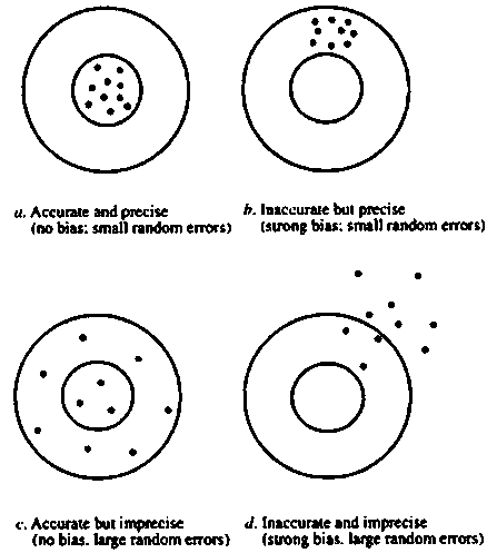 Fig. 6-1. Accuracy and precision in laboratory measurements. (Note that the qualifications apply to the mean of results: in c the mean is accurate but some individual results are inaccurate)