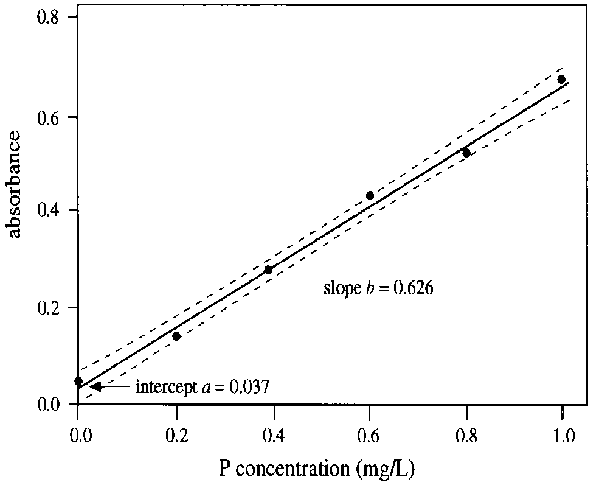 The "fitting" of the calibration graph is necessary because the response points yi, composing the line do not fall exactly on the line. Hence, random errors are implied. This is expressed by an uncertainty about the slope and intercept b and a defining the line. A quantification can be found in the standard deviation of these parameters. Most computer programmes for regression will automatically produce figures for these. To illustrate the procedure, the example of the calibration graph in Section 6.4.3.1 is elaborated here.