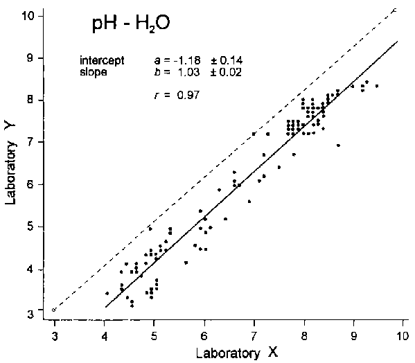In the framework of a performance verification programme, a large number of soil samples were analyzed by two laboratories X and Y (a form of "third-line control", see Chapter 9) and the data compared by regression. (In this particular case, the paired t-test might have been considered also). The regression line of a common attribute, the pH, is shown here as an illustration. Figure 6-5 shows the so-called "scatter plot" of 124 soil pH-H2O determinations by the two laboratories. The correlation coefficient r is 0.97 which is very satisfactory. The slope (= 1.03) indicates that the regression line is only slightly steeper than the 1:1 ideal regression line. Very disturbing, however, is the intercept a of -1.18. This implies that laboratory Y measures the pH more than a whole unit lower than laboratory X at the low end of the pH range (the intercept -1.18 is at pHx = 0) which difference decreases to about 0.8 unit at the high end.