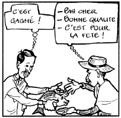 …. Exemple : un paysan organise une fête à la maison et veut acheter une dinde au marché mais n'en trouve pas. Heureusement, il y a de gros poissons frais au marché qui peuvent bien remplacer la dinde. Satisfait de son achat, il rentre chez lui. |