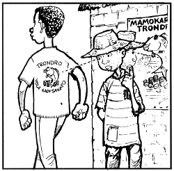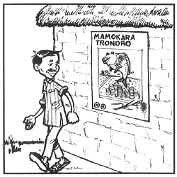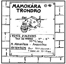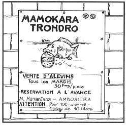 ![]() | Les affiches de sensibilisation et les tee-shirts avec le dessin “Trondro Vola sady Sakafo” (Le poisson, c'est de l'argent et de la nourriture) sont un moyen de sensibilisation au grand public qui peut créer un premier intérêt chez le (rizi)pisciculteur traditionnel sur le sujet. |