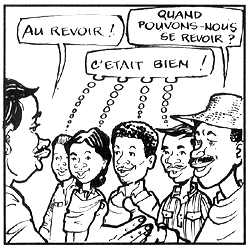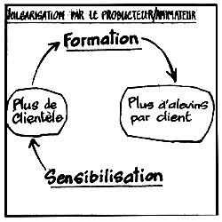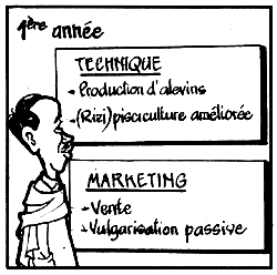 envoyés par des (rizi)pisciculteurs enthousiastes et/ou des vulgarisateurs d'autres services. Le producteur leur donne alors une formation individuelle ou les invite à une séance de formation en petits groupes. Le dialogue (voir fiche 1.5.4.(1)) devrait être l'outil de communication. |