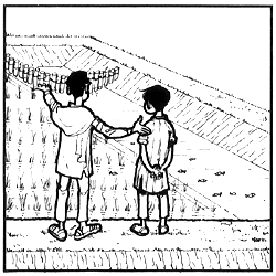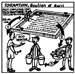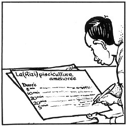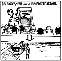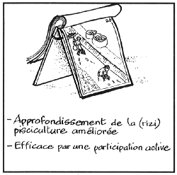 ![]() | Montrer des rizières et étangs piscicoles de démonstration aménagés correctement suivant les normes préconisées constitue également un moyen d'appui adéquat à la formation individuelle. |