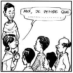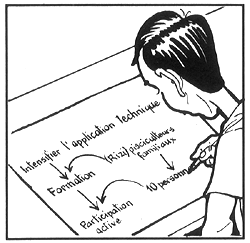 ![]() | Travailler avec un nombre de participants limité en est la condition absolument indispensable. De plus, le producteur/animateur n'occupe pas le rôle d'enseignant mais s'intègre aux participants et se comporte plutôt comme un président/animateur de séance. Les nouvelles idées sur les activités sont comparées avec celles déjà existantes, les avantages comparés aux inconvénients, etc … |