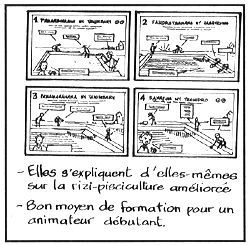 (rizi)pisciculture améliorée. Cette méthode est très efficace à condition d'être bien utilisée avec une participation active de tous les participants. Après une séance de formation avec ce matériel d'appui, un dépliant de rappel des images et des mots clés est mis à la disposition des participants à un prix symbolique. |
