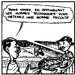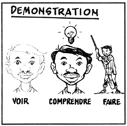 simplicité qui consiste à voir, comprendre et faire. En fait, les résultats de la séance de démonstration dépendent beaucoup des connaissances, de l'application des techniques et de la préparation effectuée de la part du producteur/animateur. Si la démonstration est mal faite, p.e. le fait de montrer une mauvaise récolte ou un étang mal fertilisé, l'animateur risquera d'obtenir un résultat contraire à celui attendu. |