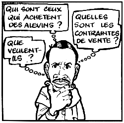 Le marché existant d'un producteur privé est composé de peu de clients qui achètent chacun très peu d'alevins. Afin d'atteindre les objectifs de vente à moyen terme, il faut élaborer une stratégie de marketing bien adaptée aux contraintes du marché. Quelques contraintes du marché qui sont plus ou moins fixes sont identifiées ici.