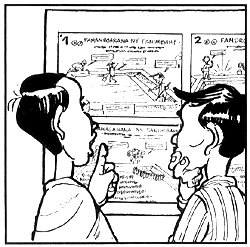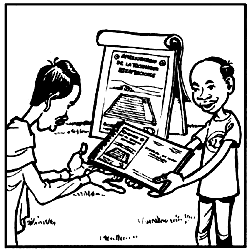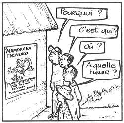 Vulgarisation, si nécessaire. A la fin de la séance, l'animateur donne un résumé des interventions et solutions proposées par l'assistance et met à la disposition des participants des brochures (rizi)piscicoles “Mamokara Trondro” à un prix considérablement réduit car subventionné (voir fiche 1.6.3.(3)). |