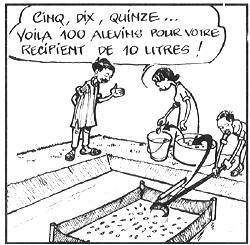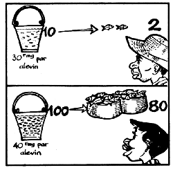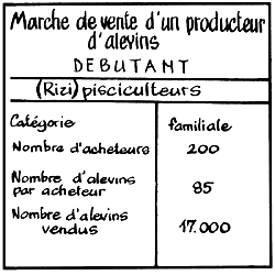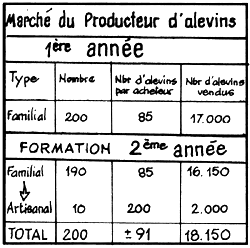 leurs alevins chez les producteurs privés d'alevins. Malgré une maîtrise technique non encore élaborée et des résultats de production encore faibles, leurs investissements d'achat se situent déjà en moyenne autour de 85 alevins par acheteur. Sans grands efforts, un producteur privé débutant peut arriver à avoir autour de 200 acheteurs, c'est-à-dire à vendre : 200 × 85 = 17.000 alevins. |