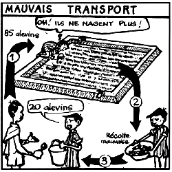 ![]() | En général, les acheteurs d'alevins effectuent mal leur transport; p.e. en transportant leurs alevins dans un petit récipient avec peu d'eau sur une grande distance à pied. En conséquence, une grande partie des alevins mourra après le déversement dans la rizière/étang et le résultat de production sera faible, ce qui freinera l'augmentation du nombre d'alevins acheté par client. |