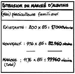 à : 2.000×100×50 = 10.000.000 alevins. Ainsi, au total, la demande potentielle d'alevins (ou marché d'alevins potentiel) est estimée à : 85.000.000 + 10.000.000 = 95.000.000 alevins. |
