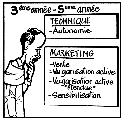 ![]() | Comment réaliser ses objectifs de vente ? D'abord, le producteur privé doit bien connaître sa clientèle et ses besoins (actuels et potentiels) ainsi que se faire connaître. Afin d'arriver à une augmentation du nombre d'alevins vendu (développement du marché), il doit également bien connaître les contraintes qui freinent ce développement. Fort de ces connaissances, le producteur privé doit élaborer une stratégie de marketing pour arriver à une vente d'alevins qui se développe progressivement. |