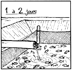![]() | Un producteur privé démarre en général la première année avec 2 étangs d'alevinage pour atteindre un objectif de production et de vente d'alevins de 10.000 à 20.000 alevins. Ce plan de production est adapté au temps disponible du producteur privé pour les aménagements et la production, mais également à un marché de vente qui est encore limité. Au cours de la première campagne, la clientèle n'achète pas plus de 85 alevins en moyenne par personne. Donc, pour réaliser une bonne cession d'alevins, le producteur privé a besoin de 200 acheteurs environ (voir fiche 1.2.1. (2)). |