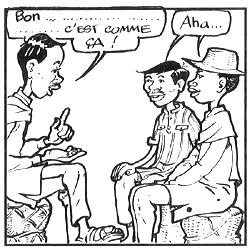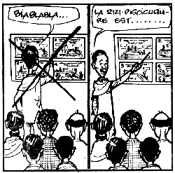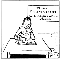 Une formation individuelle s'effectue par le dialogue. Elle sera plus efficace par l'utilisation d'affiches techniques ou par la présentation de rizières/étangs de démonstration.