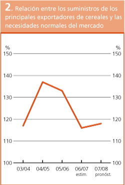 En base a las estimaciones más recientes de la producción, y suponiendo que no se produzcan otras revisiones significativas para cosechas importantes del hemisferio sur que todavía no han terminado de recogerse, se prevé que los suministros totales de los principales exportadores de cereales excederán en 2007/08 en apenas un 18 por ciento las necesidades normales del mercado, lo que representa un aumento marginal con respecto a la campaña anterior, pero aún así un nivel relativamente bajo si se tiene en cuenta que la cifra superaba el 30 por ciento a mediados de los años 2000. Esto denota que ha mejorado poco la capacidad de estos exportadores para satisfacer la demanda mundial de importaciones de trigo y cereales secundarios, e indica que probablemente continúe la difícil situación del mercado en la nueva campaña.