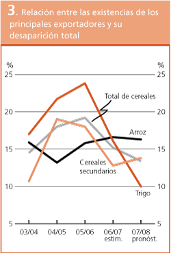 La relación entre las existencias finales de trigo de los principales exportadores y su desaparición total se pronostica en un nivel bajo de sólo 10 por ciento al final de las campañas de 2007/08. Los altos precios del trigo en los mercados internacionales ya están determinando un aumento de las importaciones de los países de bajos ingresos y con déficit de alimentos; y si la producción aumenta considerablemente en 2008 podrían seguirse consecuencias importantes para las perspectivas de la oferta y la demanda. Con respecto a los cereales secundarios, se prevé que la relación aumentará con respecto al nivel bajo del año anterior. El auge de la demanda de biocombustibles debería mantener los suministros exportables de maíz en niveles excepcionalmente estrechos aún en el caso de cosechas sin precedentes. En el caso del arroz, la relación debería variar relativamente poco, manteniéndose en algo más del 16 por ciento.
