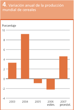 Según los pronósticos, la producción mundial de cereales aumentará en un 4,6 por ciento en 2007, lo que representaría una recuperación relativamente sólida tras dos años consecutivos de contracción. Sin embargo, en vista de la situación demasiado equilibrada demostrada por los tres primeros indicadores, se necesita otro año bueno en 2008, especialmente para el trigo.