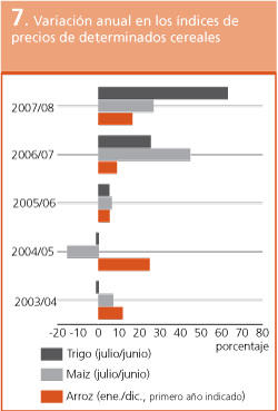 La dificultad mayor de la balanza mundial de cereales en 2007/08 ha hecho subir los precios de todos los cereales. Los incrementos más significativos han sido para el trigo, cuyo índice de precios durante los primeros cinco meses de la corriente campaña comercial (julio de 2007 a noviembre de 2007), ha sido por término medio superior en un 63 por ciento a la media correspondiente a 2006/07. Con respecto al maíz, el aumento de los precios ha sido menos significativo, ya que el índice aumentó cerca de un 27 por ciento, pero después de haber aumentado cerca del 45 por ciento el año anterior. En cuanto al arroz, en lo que va de 2007 se ha registrado un aumento moderado del 16,4 por ciento. Estos aumentos están contribuyendo a un notable incremento de la factura de importaciones de cereales de los PBIDA en 2007/08, que subirá un 27 por ciento hasta alcanzar los 31 mil millones de dólares EE.UU. aproximadamente. El hecho de que también el año anterior la factura de las importaciones de cereales haya aumentado de forma pronunciada hace que la situación actual sea tanto más onerosa para los PBIDA, especialmente para aquellos países que necesitan más importaciones para cubrir los déficit de producción interna.