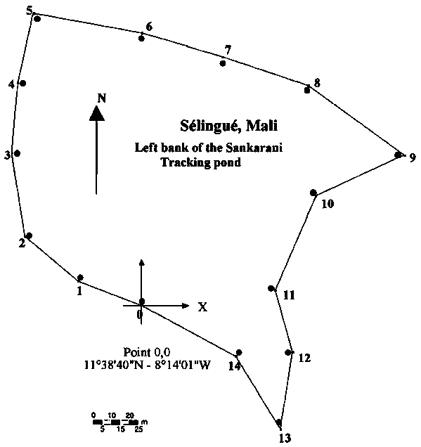 Wooden marks were set on the shore of the pond, and their respective positions were determined using three alternative methods (theodolite, GPS and successive polar coordinates combining compass and pentadecameter).