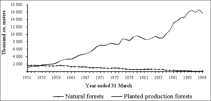 The establishment of planted forests with fast-growing non-indigenous softwood species in the 1920s and 1930s by the State, and parallel programs by private companies, sought to offset future timber supply shortfalls that were predicted in 1913.