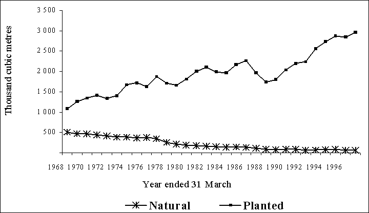 Planted forests have steadily replaced the natural forests as the mainstay of the wood processing industry since the 1950s. The industry has emphasized the utilization of increasing volumes of relatively fast-growing radiata pine. In 1998, 16.3 million m3 of roundwood (over 99 percent of the total) were harvested from planted forests and less than 0.1 million m3 came from natural forests. Much of the radiata pine is in the post-tending age class range (10 to 25 years). Maturing stands mean that the total production is likely to double within the next 10 years.