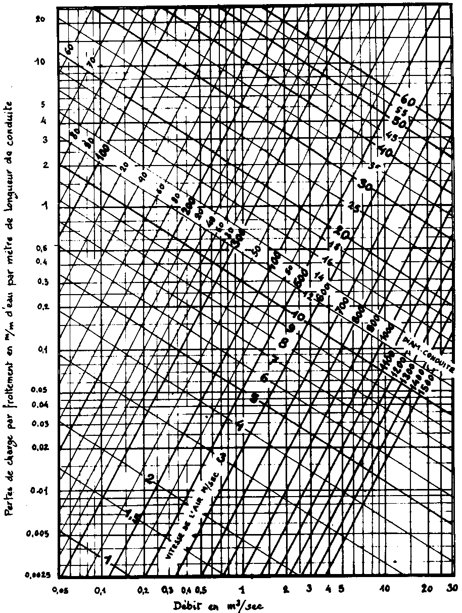 Cependant, pour éviter les calculs, il existe des abaques (Fig. 160) qui donnent la perte de charge par mètre linéaire de conduite en fonction du diamètre équivalent de la conduite et du débit.