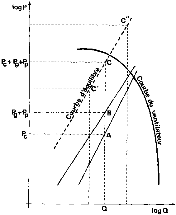 - le point B d'ordonnée Pg + Pp, somme des pertes de charge dans le produit et au passage de la gaine. Ces deux pertes de charge varient selon une relation de la forme