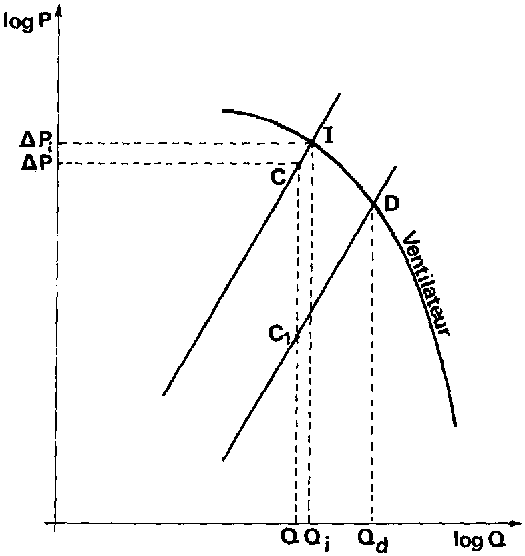 Par ce point C1, on mène une parallèle à la courbe d'équilibre. Cette parallèle coupe la courbe caractéristique du ventilateur au point D. L'abscisse de D donne le débit réel de ventilation, d'où on pourra déduire le débit spécifique par mètre cube de produit. Il est intéressant de connaître le débit spécifique pour différentes hauteurs de produit, car, connaissant les débits spécifiques nécessaires suivant l'humidité du produit, le chef de silo peut répartir judicieusement les apports en fonction de leur risque de dégradation plus ou moins rapide.